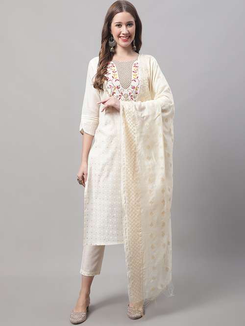 - Find gorgeous sets of ethnic wears in trending designs in off white colors suitable for a number of occasions.