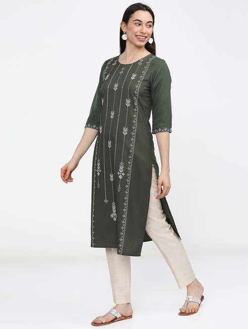 - Grab this beautiful kurta made up of cotton blend fabric featuring round neck designs.