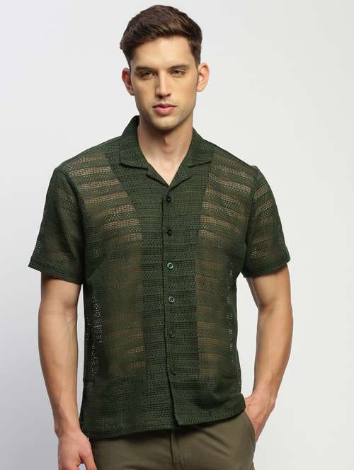- » men olive self design cotton blend casual shirt
