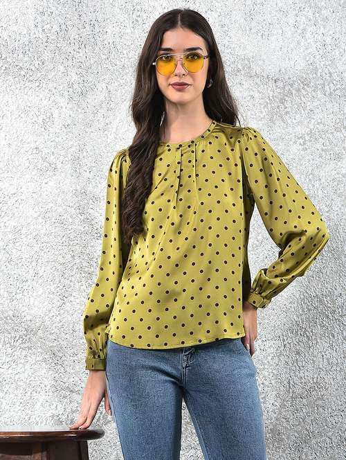 Update Your Casual Wear With This Fashionable Crimsoune Club Women's Olive Polka Dots Top. The Earthy Tone Mixed With The Playful Pattern Is Effortlessly Cool And Easy To Style.