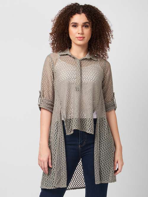- » women roll-up sleeves collared high-low top