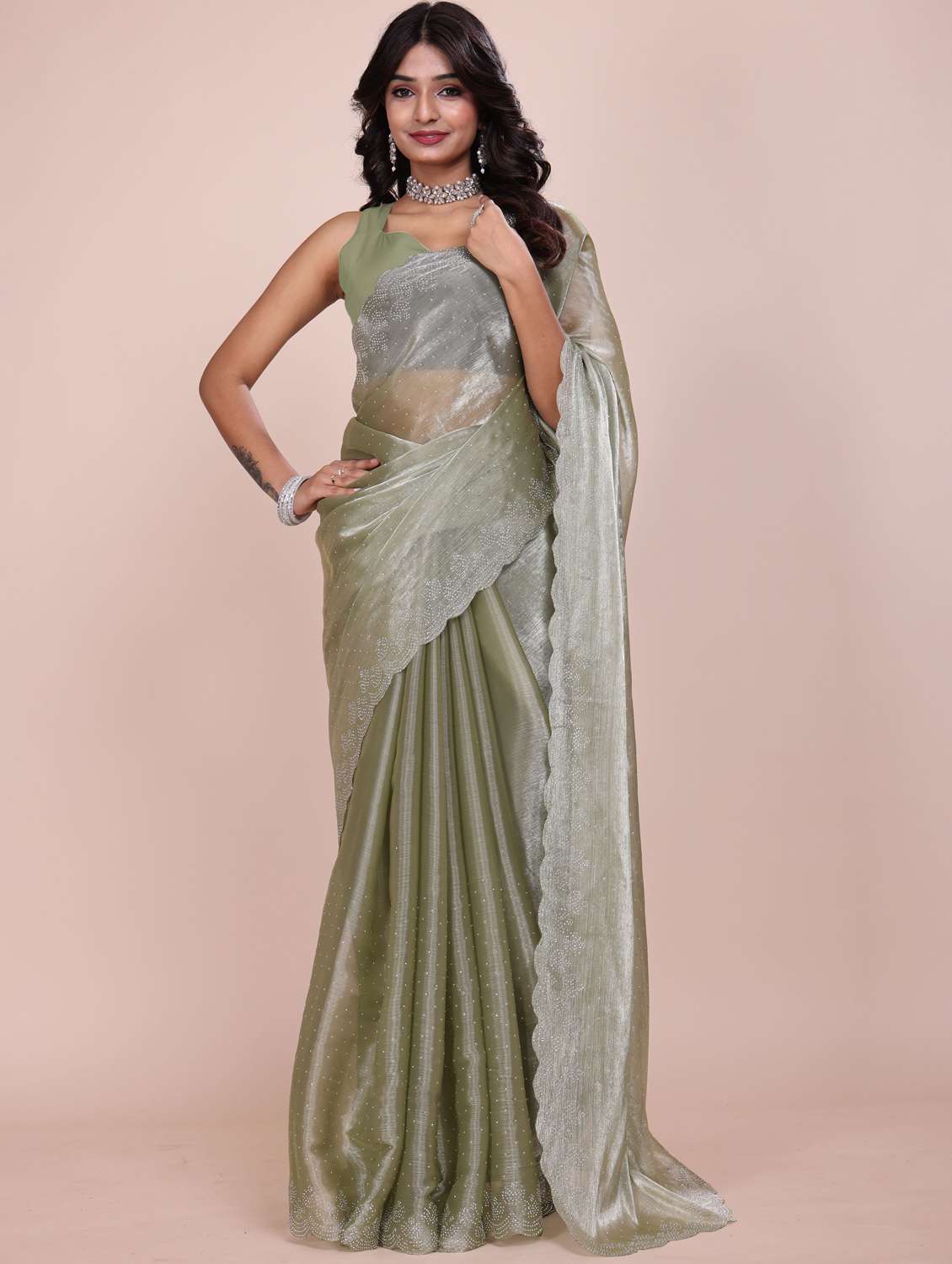 Women's Soft Zimmy Choo Shimmer Chiffon Fandy Silk Saree With Stone Work & Comes With Unstitched Blouse Piece (Chhaava)