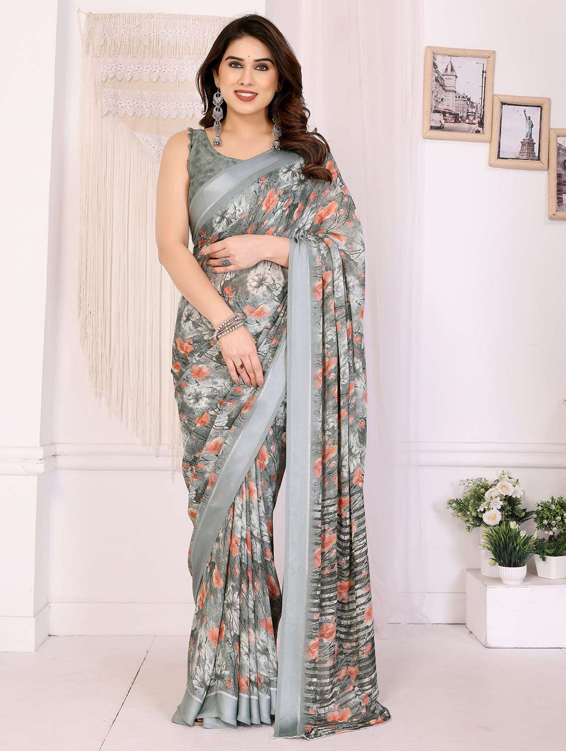Bright Moss Floral Printed With Satin Patta Border Saree With Blouse Piece Pista Refresh your ethnic collection with this pista green saree featuring a delicate moss floral print. The soft pastel tone is perfect for daytime functions, while the satin patta border adds a hint of luxury. Lightweight and easy to drape, this saree includes a matching blouse piece, making it a stylish choice for festive and casual wear.