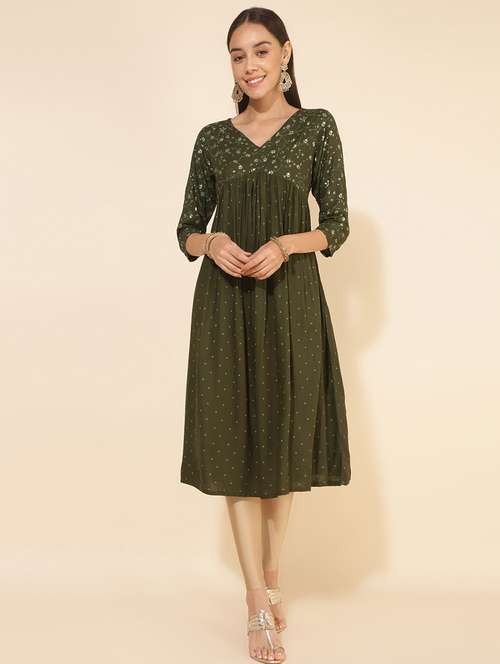 - » women olive v neck flared kurta
