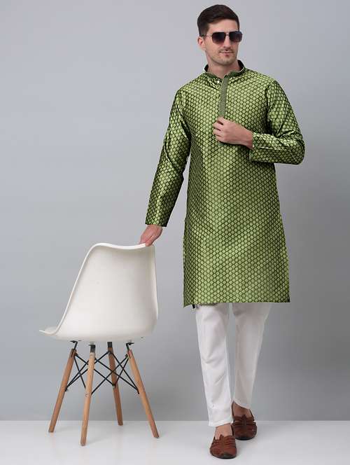 Olive Green and white Collar Embroidered Kurta Pyjama Set, Olive Green straight above knee kurta, has a mandarin collar, long sleeves, straight hem ,White solid churidar, drawstring closure