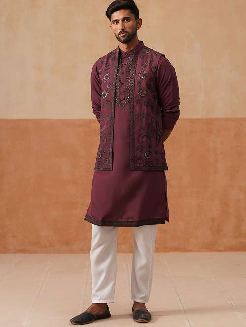 - » men solid with work mandarin neck kurta pyjama with jacket set