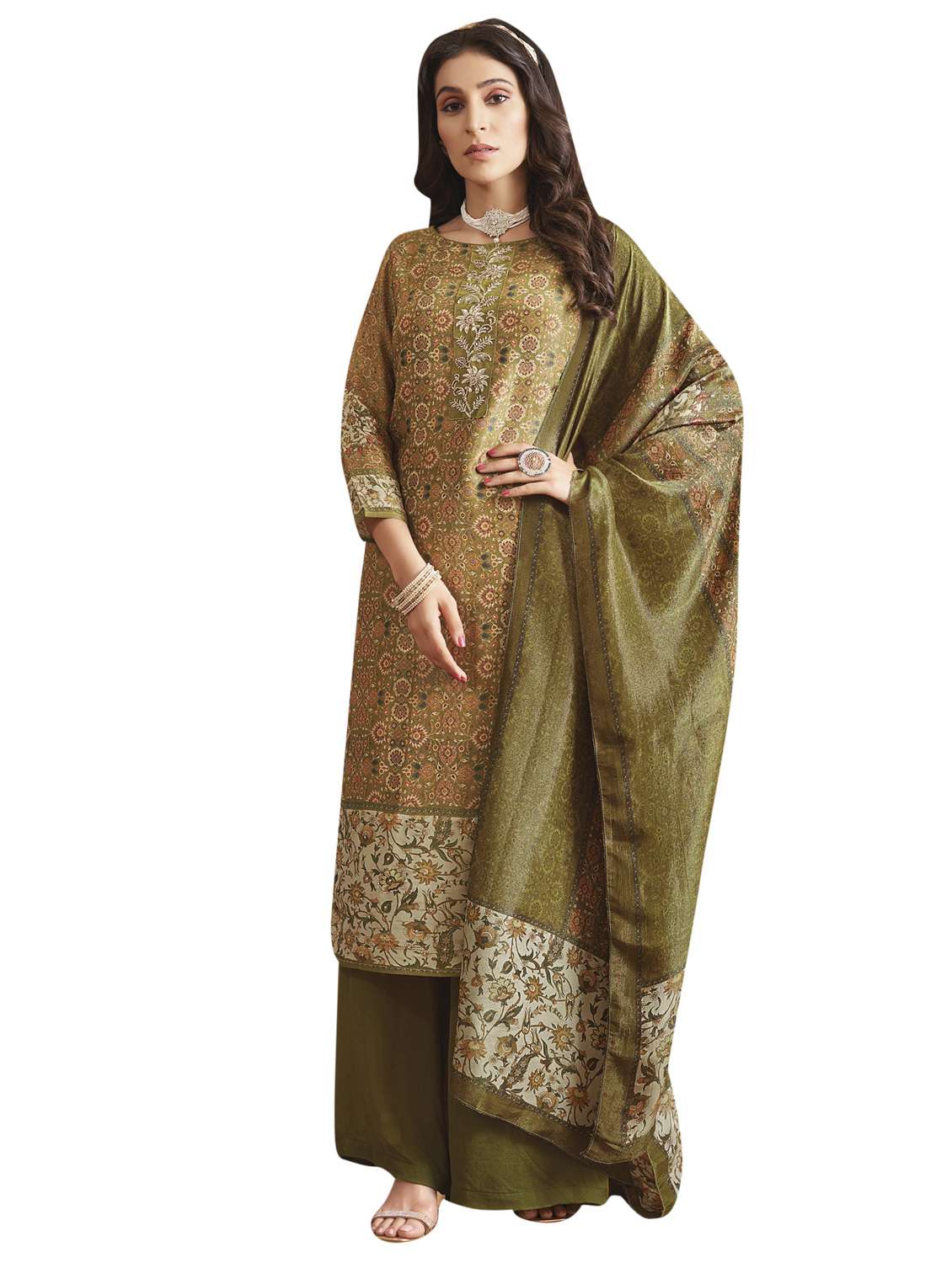 women olive floral print unstitched suit