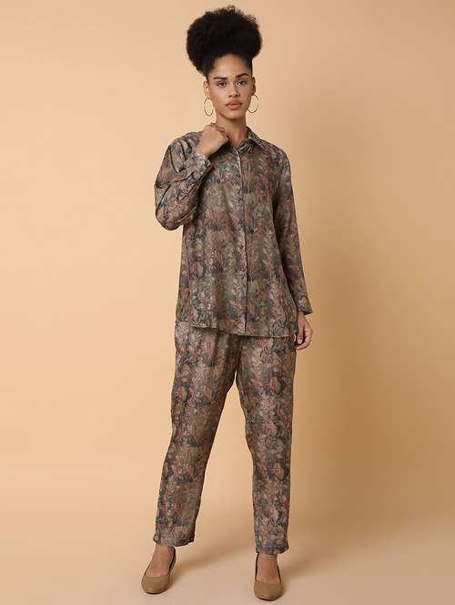 SHOWOFF Women's Printed Collared Olive Shirt and Trousers Set