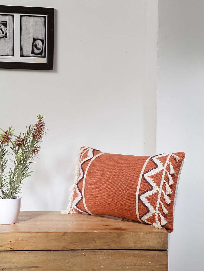 blanc9 tribal tassel rusty orange embroidered cotton square cushion cover 12x20inches