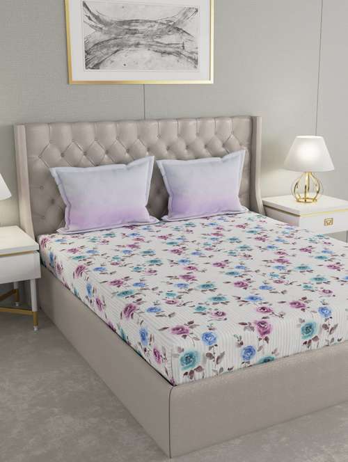 - » gm floral 144 tc 100% cotton digital print white, purple & blue double bedsheet with 2 pillow covers