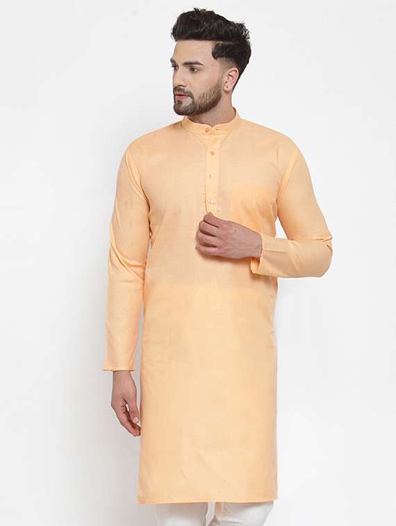 Orange Solid Cotton straight kurta, has a mandarin collar, and straight hem