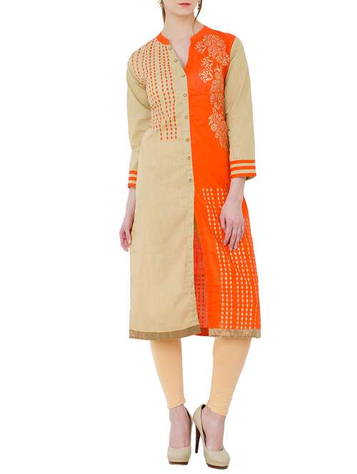 orange and beige cotton printed straight kurta