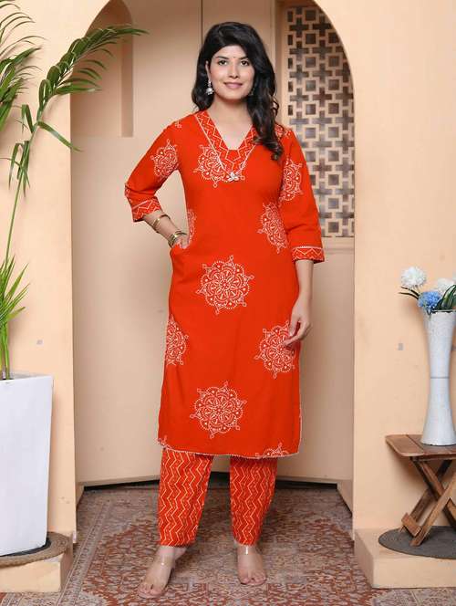 - Find gorgeous sets of ethnic wears in trending designs in orange colors suitable for casual wear of occasions.