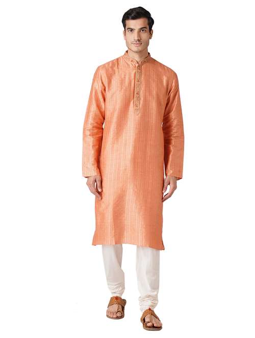 - » peach self design long kurta with embroidered neckline