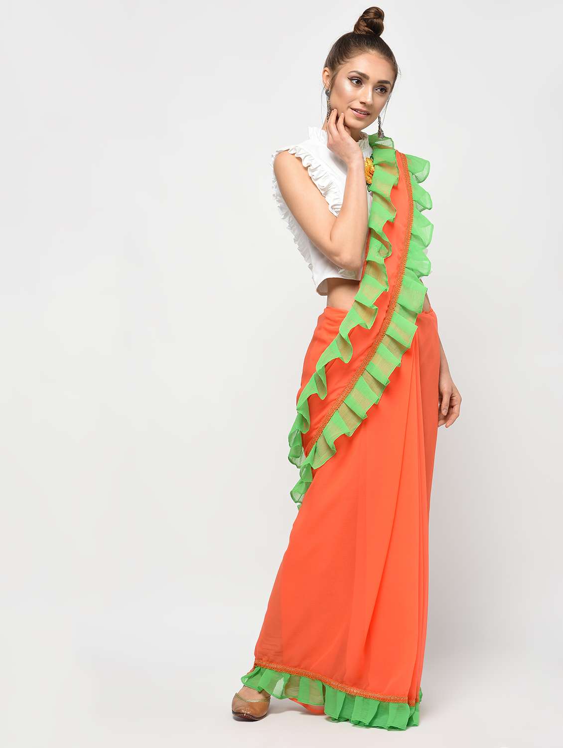 contrast ruffle border orange saree with blouse - 15924779 - Very Small Image - 1