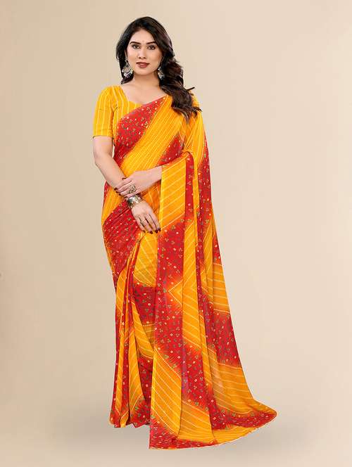 Step into timeless tradition with a modern twist in this elegant Orange printed georgette saree. Featuring a beautiful combination of Orange and Yellow hues, enhanced with bandhani-style dotted patterns and tiny floral motifs, this saree brings cultural charm to your everyday and festive wardrobe. The lightweight georgette fabric offers a flowy and flattering drape—perfect for warm weather or day-long events.