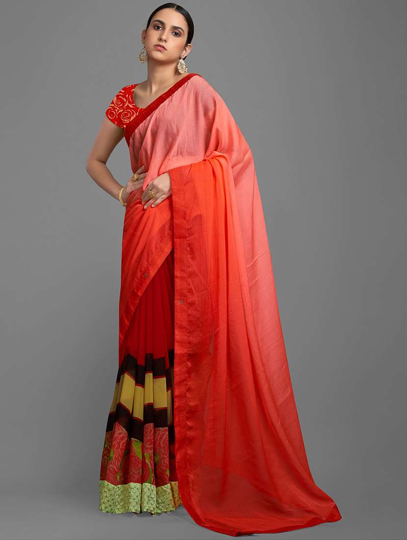 Splash a sensation of innocence and beauty with this orange and red colored half-half saree. This magnetize saree prettified with beautiful print work which makes it more elegant look. This saree is made of georgette chiffon blend fabric accompanied with unstitched matching blouse piece which can be designed as per your style & requirement. This saree is perfect for parties, festivals and occasions, where you want to be center of attraction. Pair it with stylish accessories to make your look more beautiful. It's a must have saree in your ethnic collection. Buy this saree now as it's a unique piece with attractive color and beautiful designs which is rare to find.