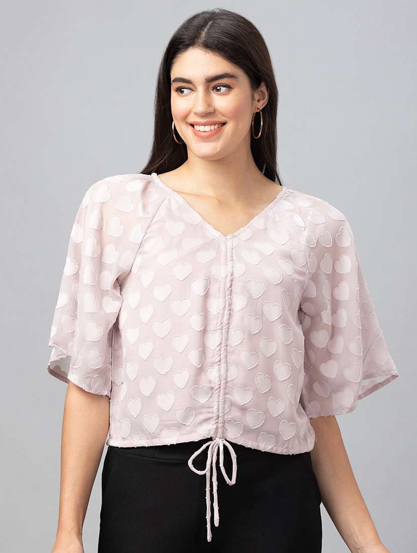 Women peach self design regular fit top has V-neck, three-quarter raglan sleeves, tie-up at waist and crop length.