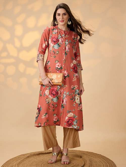 - » globus women orange mandarin collar embroidered hem sleeves floral print button down a-line festive kurta