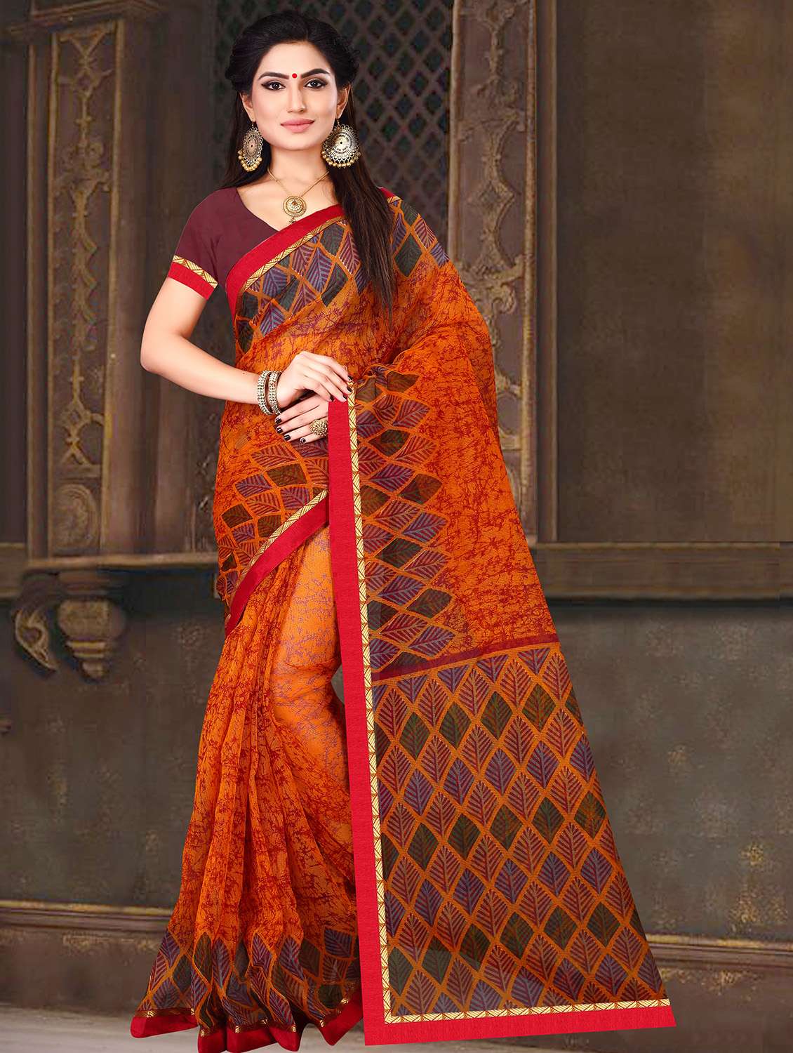 - » women's printed orange colored saree with blouse