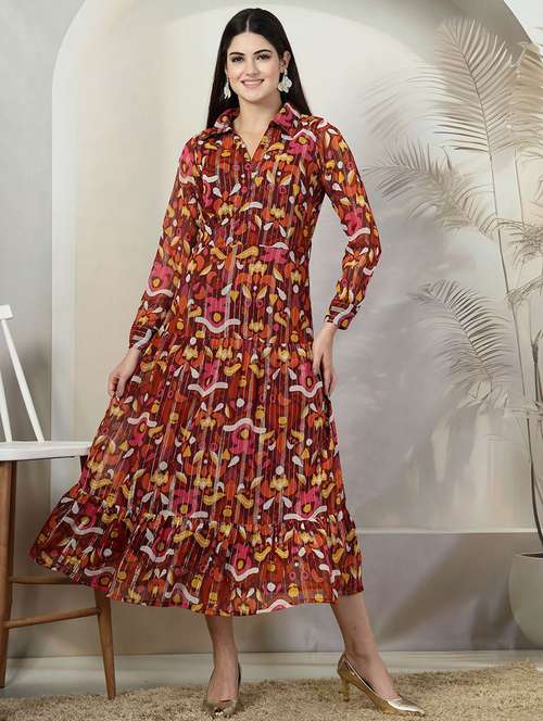 - Dress up in a soothing pattern and don this dress made of polyester material.