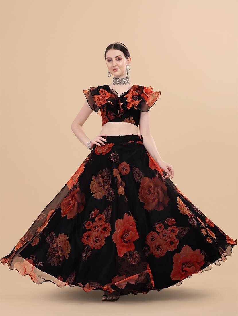 - » orange printed flared lehenga