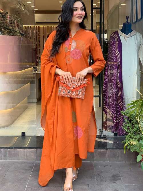 - Find gorgeous sets of ethnic wears in trending designs in orange colors suitable for festive wear of occasions.