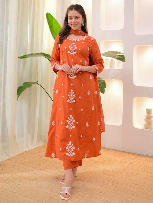 - Find gorgeous sets of ethnic wears in trending designs in orange colors suitable for festive wear of occasions.