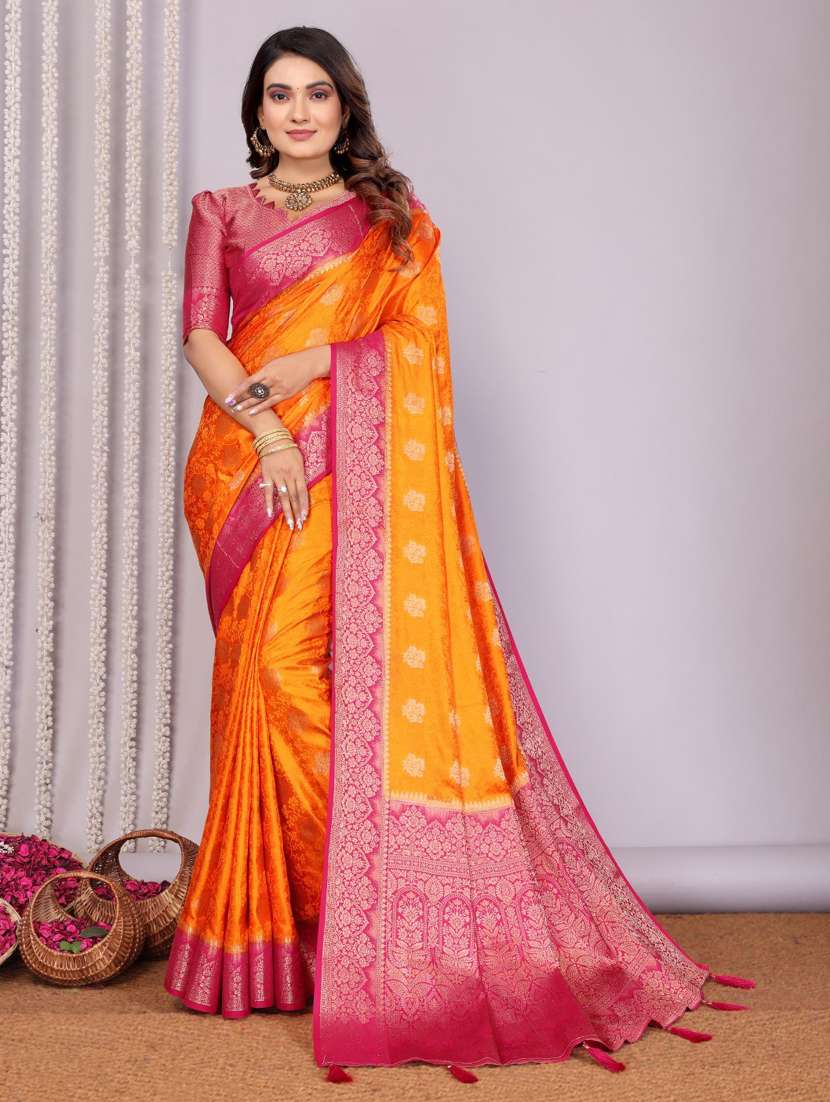 Orange Satin Silk Saree With Contrast Zari Woven Borders
