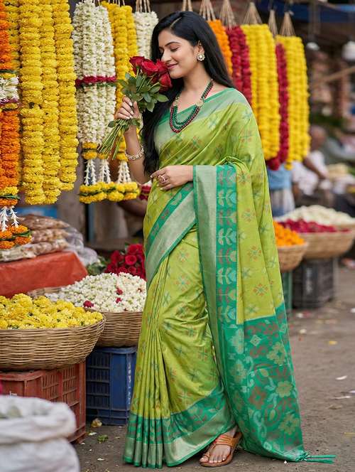 The bright orange body symbolizes joy and energy, while the grand green pallu with intricate ikat motifs showcases traditional craftsmanship that dates back generations. The contrast border and zari detailing add a royal touch, making this saree ideal for weddings, festivals, religious ceremonies, and cultural gatherings.