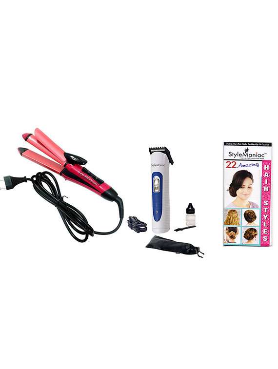 - » 2 in 1 hair straightener cum curler:: 1 trimmer , 1 charger , 1 brush , 1 oil:: 1 free hairstyle booklet