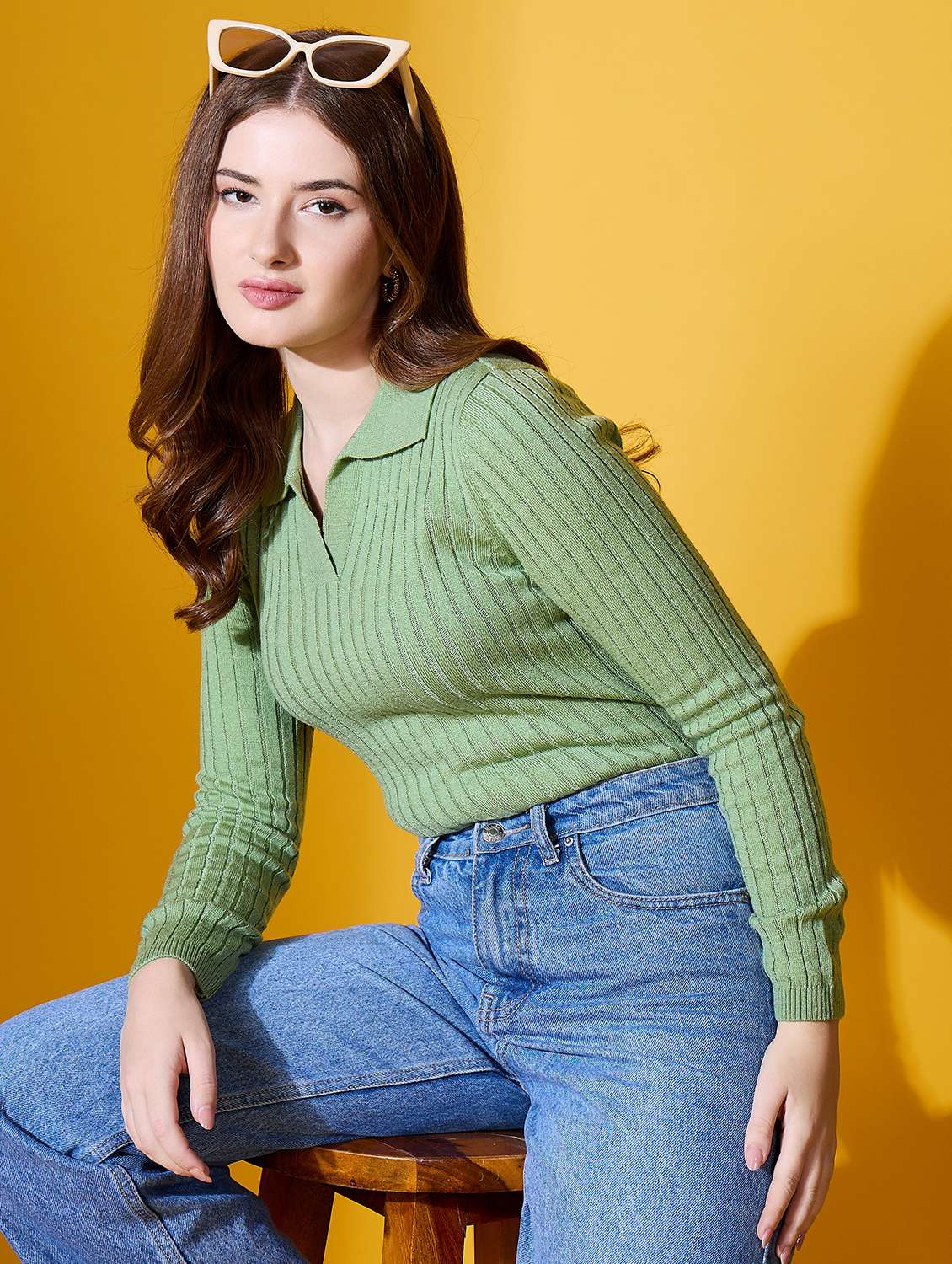 - » women solid collared long sleeve pullover