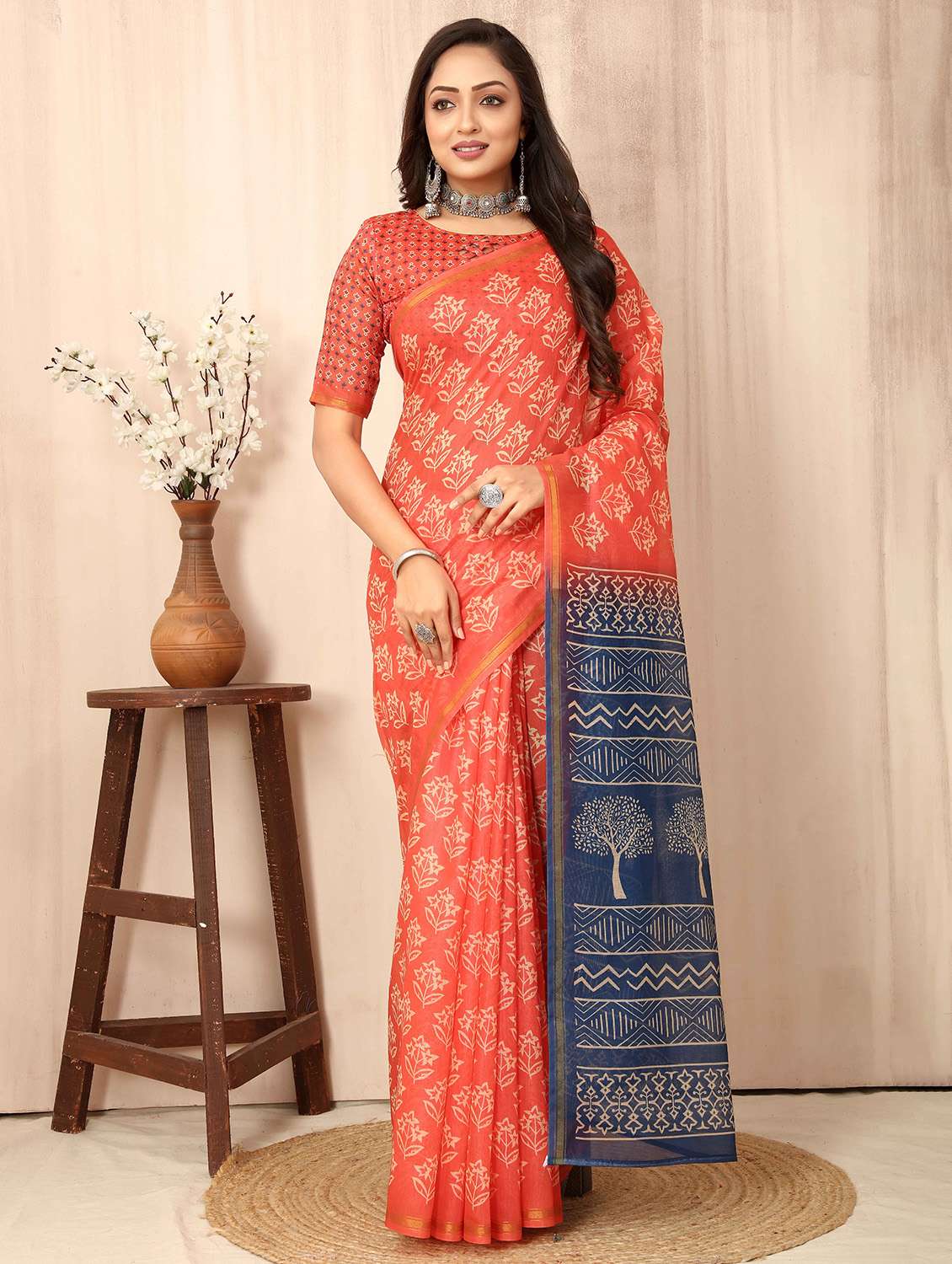 peach printed saree with blouse