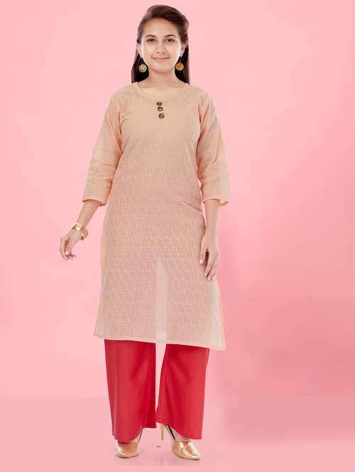 girls peach round neck straight kurta