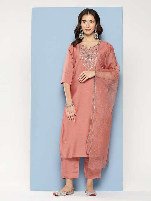 women embroidered three quarter sleeve kurta pant with dupatta set