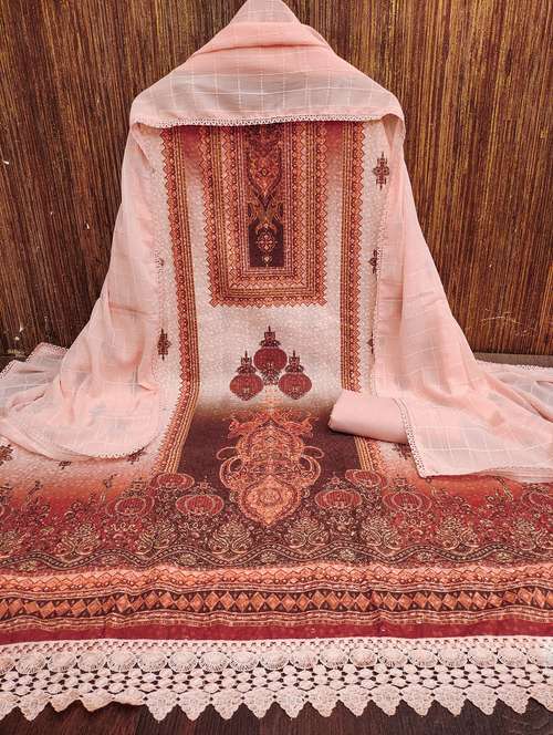 - Look ultra gorgeous in unstitched suits from Leeli Peeri Designer and grab these beautiful suits in peach colour.