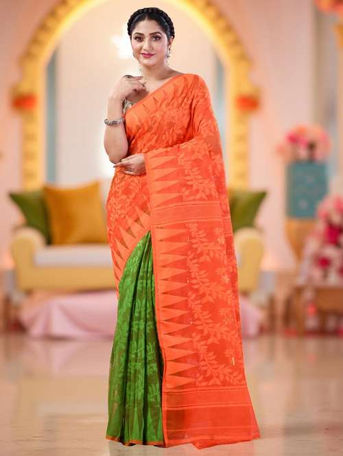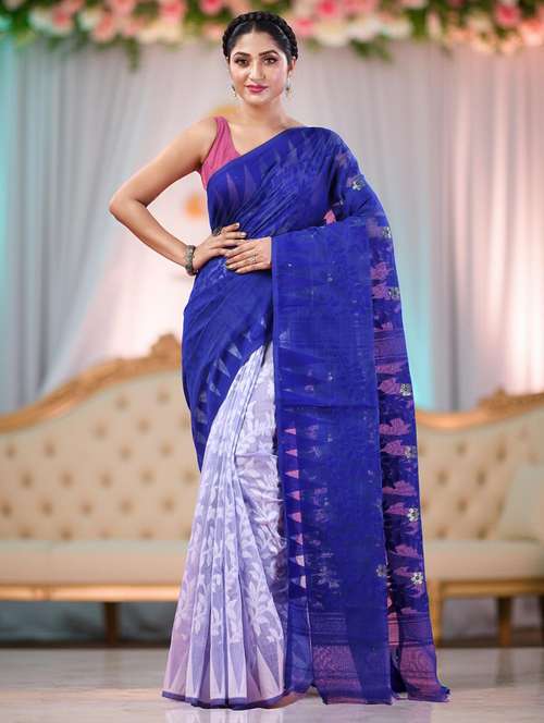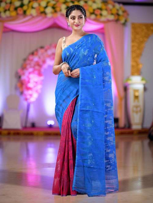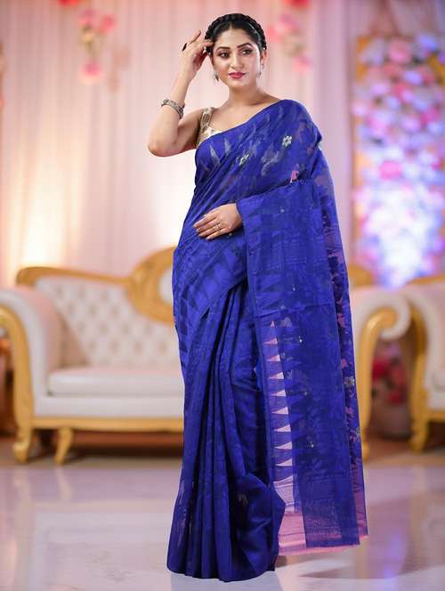This Jamdani saree is crafted using traditional Dhakai handloom techniques, featuring fine thread work spread across the entire body. The detailed weaving is carried out by skilled loom workers, creating a balanced pattern that reflects classic Bengal craftsmanship. The saree follows the natural drape and softness associated with pure Dhakai Jamdani sarees for women, making it suitable for ceremonial wear and bridal function styling