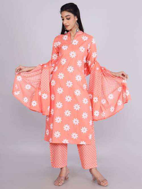 - Find gorgeous sets of ethnic wears in trending designs in peach colors suitable for casual wear of occasions.
