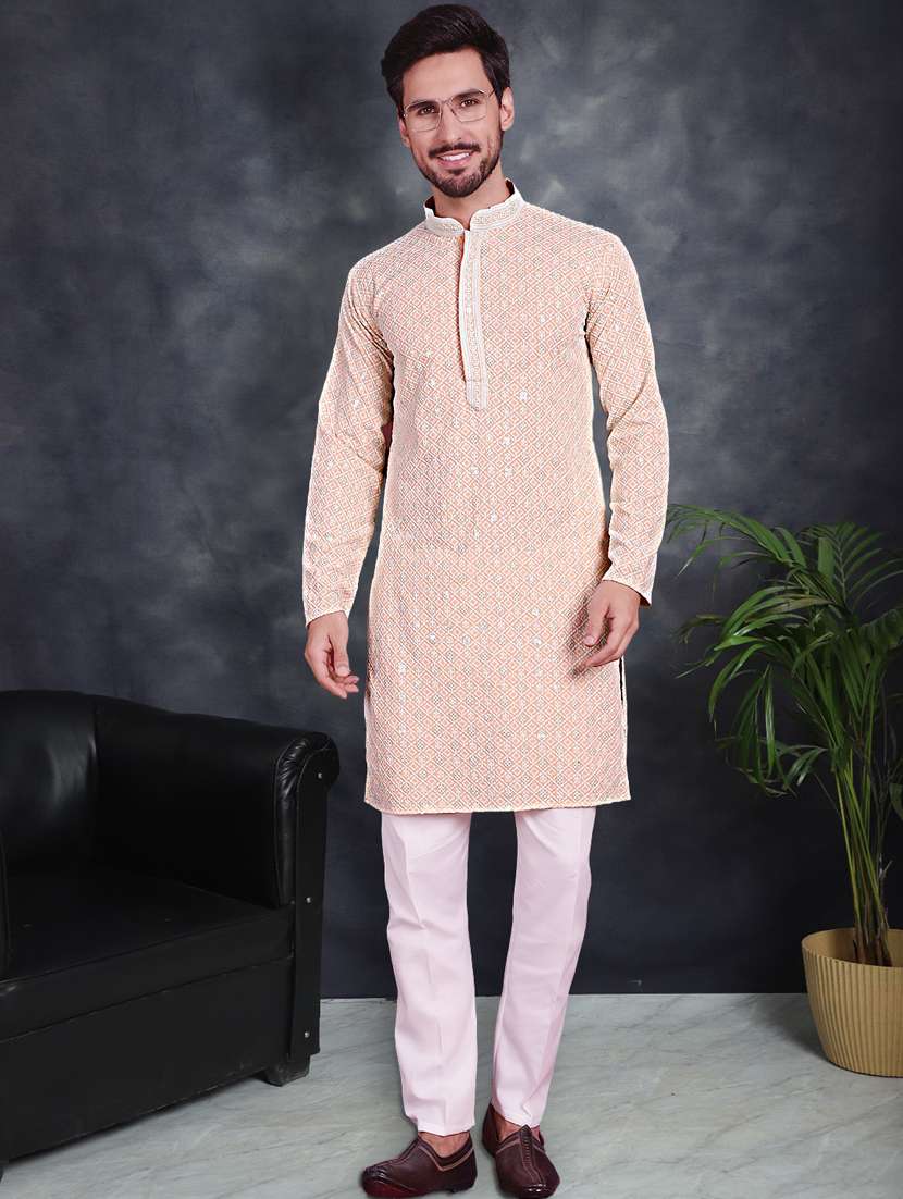 Men's Peach Chikankari Embroidered and Sequence Kurta with Pyjama.