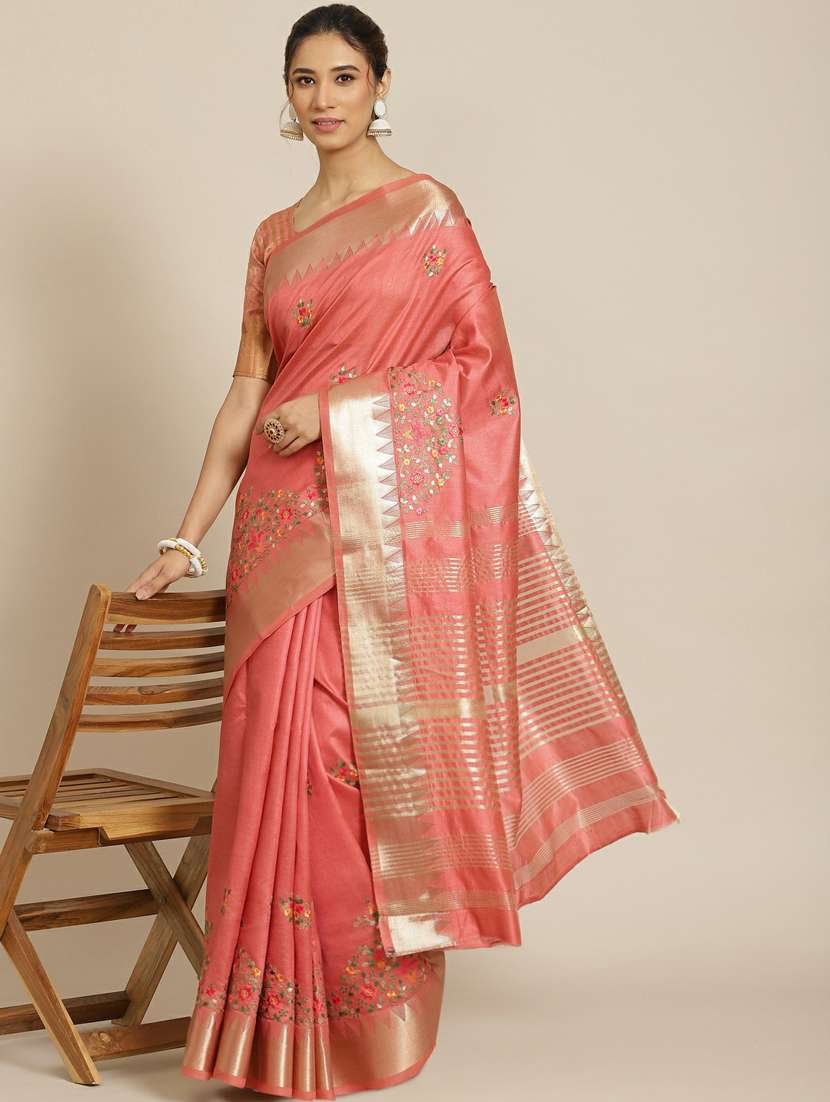 Riva Enterprise Women's Assam cotton Silk With golden border And multicolor thread embroidered Saree
