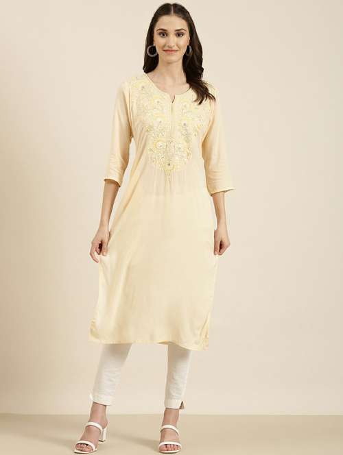 - Grab this beautiful kurta made up of cotton fabric featuring round neck designs.
