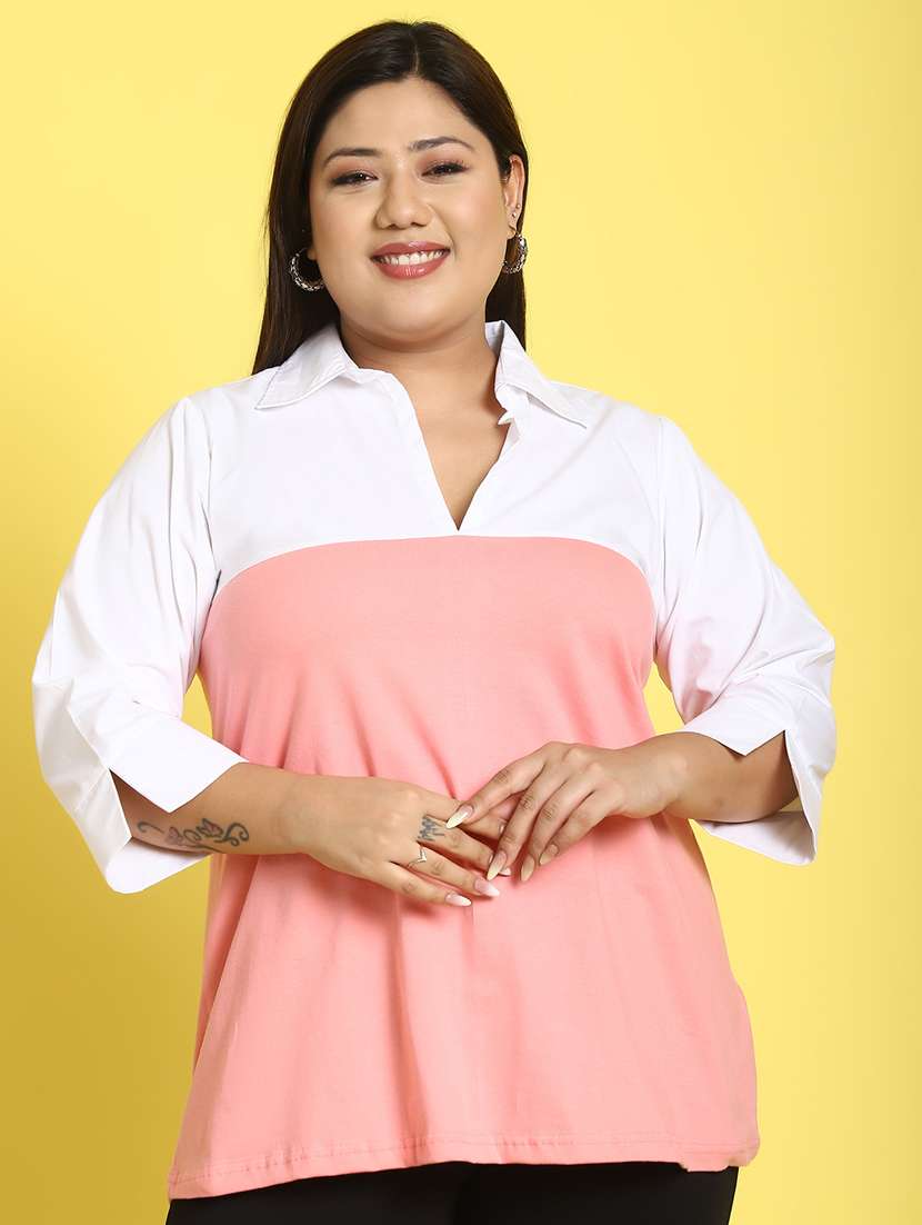 theRebelinme Plus Size Women Dark Peach & White Color Block Shirt Collar Top, has a spread collar, 3/4th sleeves and cuff detail.