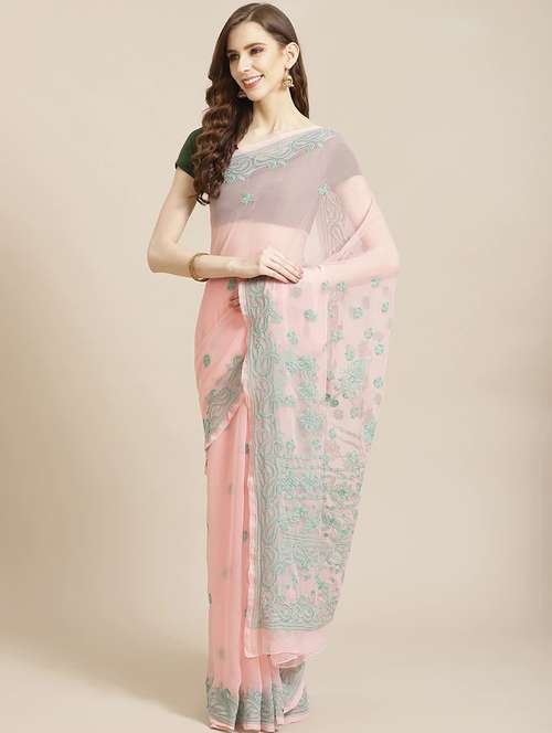 Feel elegant with Ada Chikankari saree. The alluring Peach Faux Georgette saree weaved with green cotton thread. The fabric is lightweight and soft, best for any season use. Disclaimer - Blouse Shown for Photo shoot Purpose. Running Blouse piece Fabric within the saree. This product is hand embroidered and may have slight dissimilarities that are a natural outcome of the human involvement in the process. These minor variations of Stitches/Motifs add to its charm and ensure you have a unique product.