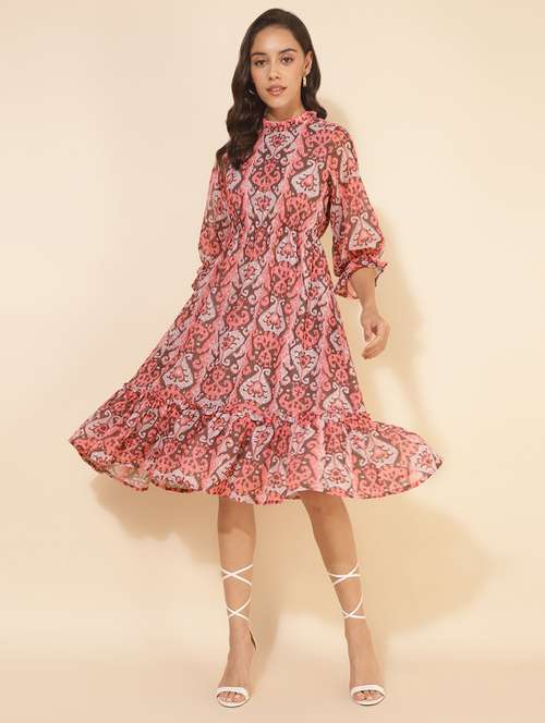 Style yourself in Janasya Women's Peach Ikkat Printed Fit & Flared Dress. This calf-length dress in delightful peach doby georgette boasts 3/4 puff sleeves, a high neck, and charming Ikkat print. Adorned with all-over gathers and ruffles, it features fabric buttons and loops. Experience a touch of pink and timeless elegance in this dress.