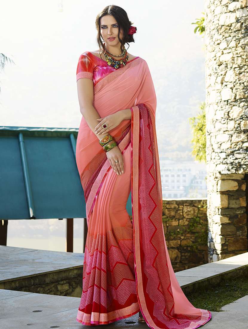 Shaily Retails look simple and sober stylish peach georgette printed saree. This beautiful casual saree is elegantly decorated with gorgeous prints and pattern that gives a perfect look to the outfit. This saree is an ideal for casual functions and social gathering. Saree comes along with matching fabric unstitched blouse piece. Saree Length:- 5.5 MTR, Saree Fabric:- Georgette, Blouse Fabric:- Silk, Blouse Length:- 0.80 MTR Note : All products of Shaily Retails comes under the copyright with trademark under Gujarat Commercial Tax.