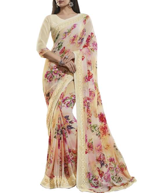 embroidered border floral printed saree with blouse - 16135558 - Very Small Image - 1