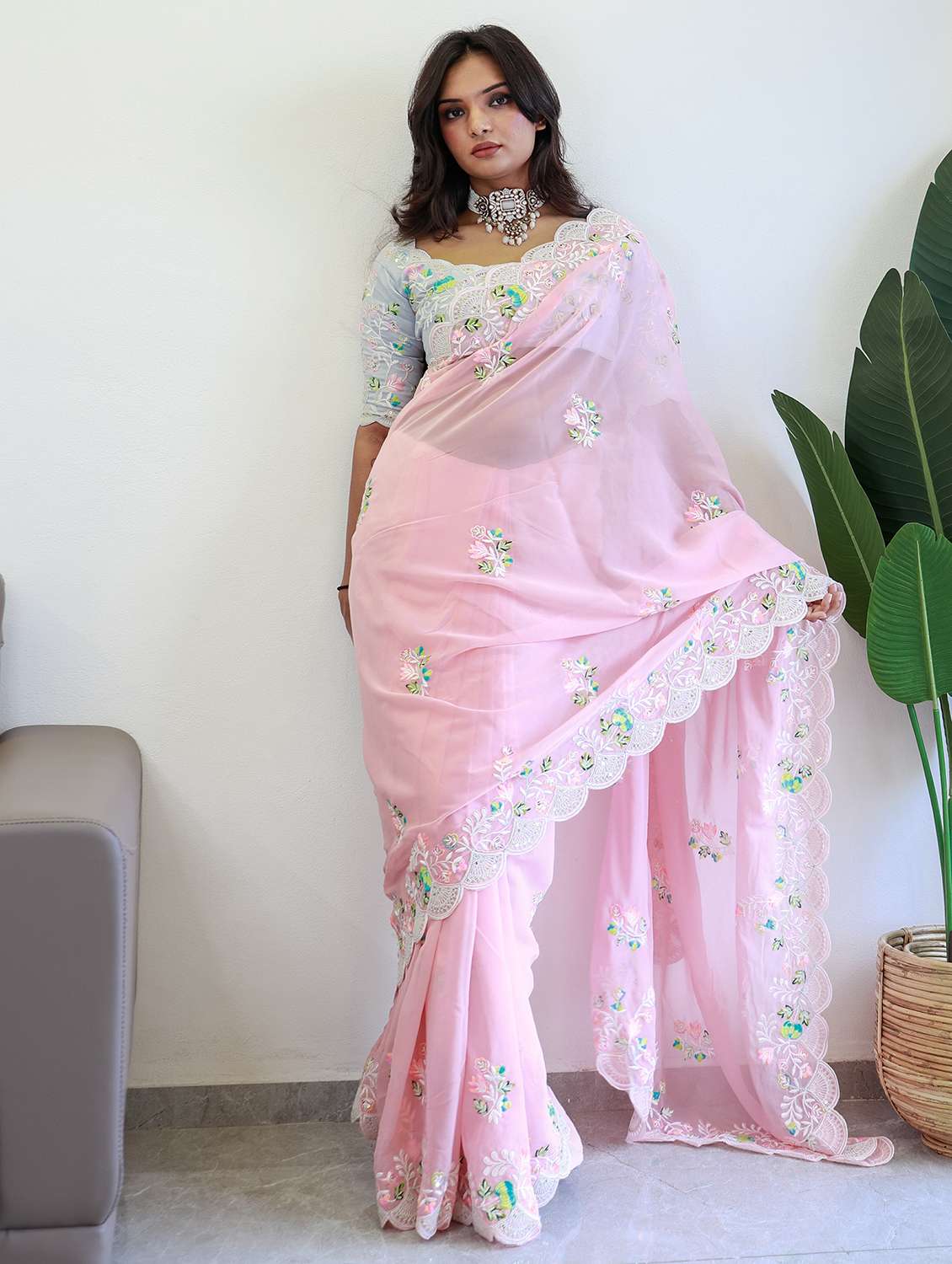 women pink embroidered saree with blouse