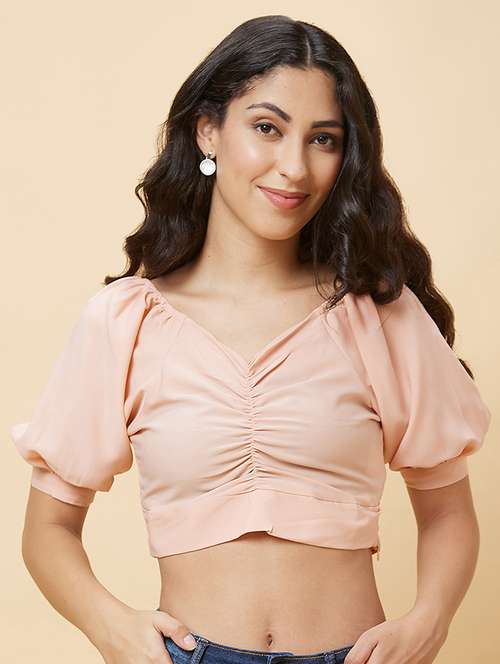 Globus presents these fashionable and classy Women Peach Solid V-Neck Ruched Casual Crop Top with Short Raglan Puff Sleeves. Made with superior quality skin friendly Polyester fabric for comfort of wearing. The Casual Top are sure to keep you looking stylish and feeling comfortable through the day. So go ahead, stand apart from the crowd and create your own trends.