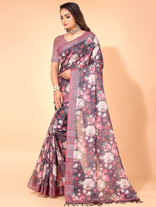 brown floral print saree with blouse - 21218168 - Very Small Image - 1