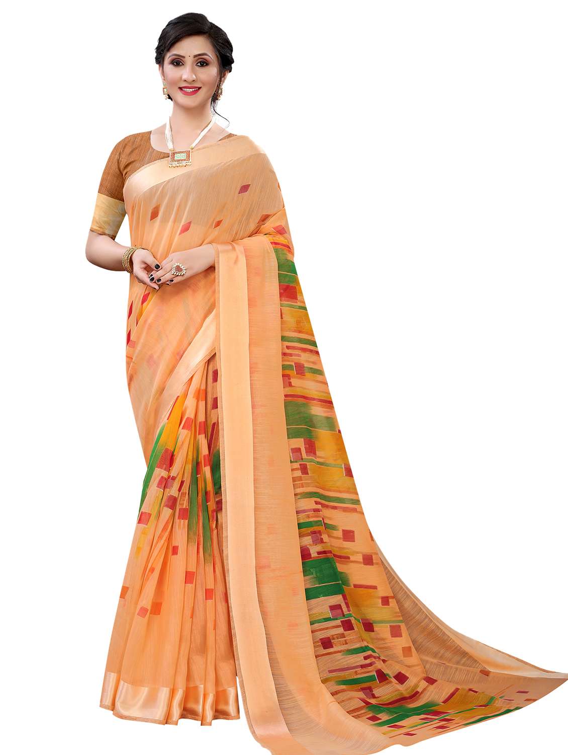 Soft Cotton Linen Saree with Abstract Prints. Saree is Crafted with Satin Patta in weave.